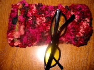 あとは同じように 凸の糸を引っ張り、回し糸にかぶせて向こうに落とす を繰り返す。 約一時間、ダラダラ続けてみると、 眼鏡ケース の出来上がり。