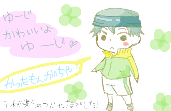 ヒデ様はBLゲームの声優をやってほしいよ!! 四天元気だなぁ! 千歳が元気だなぁ!もさもっさしてない! 白石は四天の柱だって感じがした!柱だった! 金ちゃんかわいいなぁ!金ちゃんって感じのわがままいいなぁ!でも何て言ってるかわからな…(rv ゆーじが漢前やーーーーーーーーーーーーー!!!!!!! 小春が真正で本気もびびった。 AのゆーじとBの小春がペア組んだらラヴ過ぎて18禁だし、Aの小春とBのゆーじが組んだら両方Sだから違う意味でキケンw モンドいいね!モンド好きだ!!情熱的! 5代目不二のダンスがかわいかった。古川くんたちの凄さが身に染みました。 財前くん、こっちもかわいいわ!ちょっと金ちゃんとにゃんにゃんしまくりです!子猫が、子猫が戯れてる!