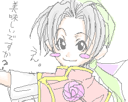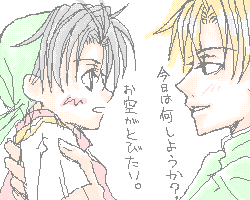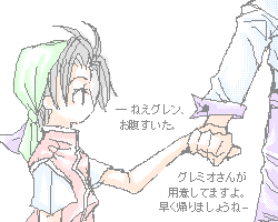 リベンジ、ちっこい坊ちゃん。 ご飯までグレンに連れられちょっとお散歩。 何故グレンかというと、私が彼を好きだから。(2でグレンアレンに話し掛けられなくて 物凄く口惜しい気がしたものです。←何度もしつこくアタックした) 何故小さいかと言うと、 小さい坊を描きたかったから。 絶対愛らしかったはずです。幼い坊。 |