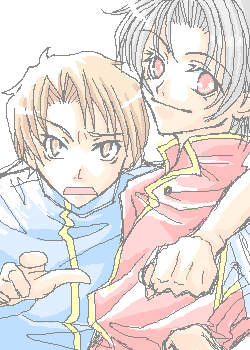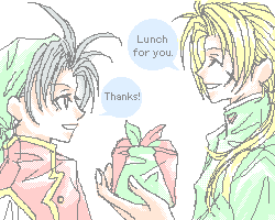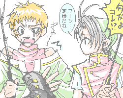 「えーッ! いいじゃん、こいつは今から俺と遊ぶの!!」 「ごめんね、グレミオ。そういう訳だからまた後でね!」 「よしっ! それでこそ俺の親友!」 「それはいいから、腕、重いよ。テッド」 そんな仲良し二人組み。 あぁもう、テッドがテッドがーッ!!!! 彼との別離が子供時代との別離。幼さの乖離。 彼が生きていたならば・・・どんなにか坊ちゃんは救われただろうか。 話し変わってテッドって300歳・・・ですよね。 普通なら枯れてるお年頃〜。そんな彼が 坊ちゃんと一緒になってワイワイ遊んでいるのを妄想するとひどく楽しいです。(楽しいのかッ) 是非我侭言い放題で坊ちゃんを翻弄して欲しい。そして密かに暖かな目で成長を見守っていて欲しい。 って、其処まで行くと物凄い妄想・・・笑 |
